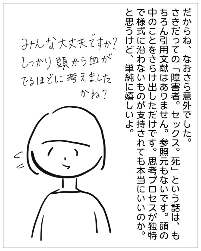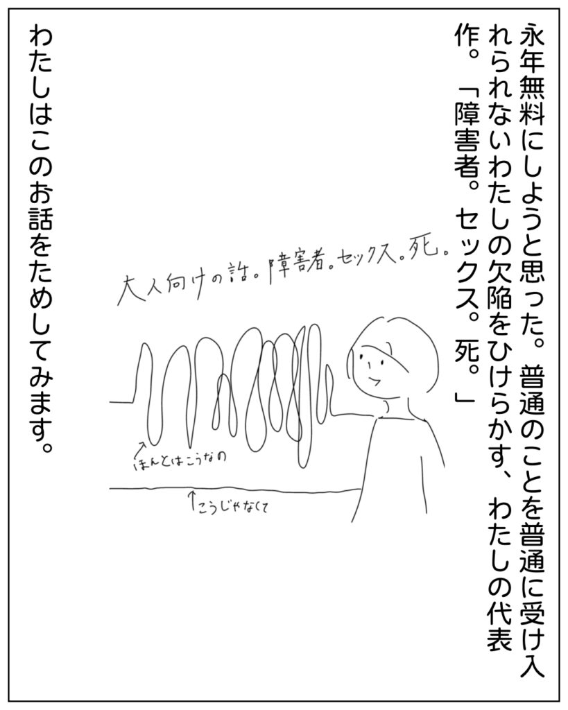 ただ、こういうわたしの「差別ってほんとうはなんなのか?」っていうような、人々の普通観に斬りこみを入れるような話が脚光を浴びること自体が、なんだかものすごくおもしろいことのように思えるんです。もし脚光を浴びるのであれば、なんですけどね。