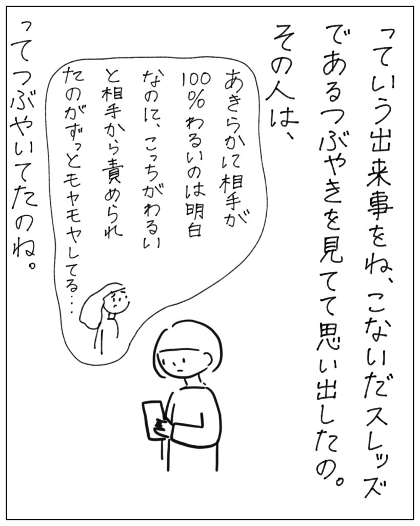 今日の漫画は、スレッズで、「明らかにあちらさんが100%悪いはずなのに、あのときこちらが悪いように責められたことにたいして、何日経ってもモヤモヤする。」というつぶやきを見かけたことをきっかけにして描いた漫画です。