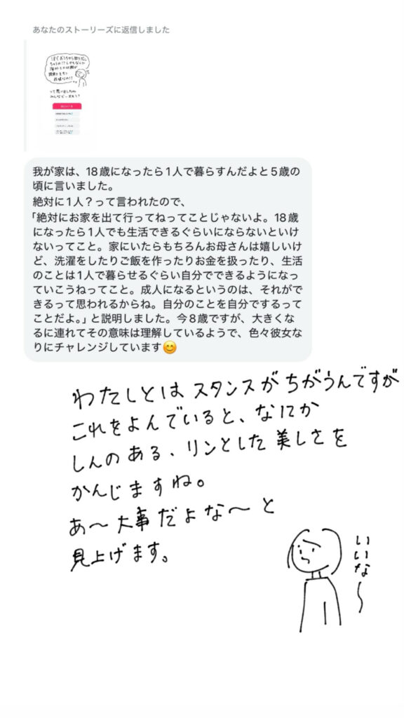 ところで、つい最近、インスタグラムで、子どもの自立に関するアンケートをとりましたら、たくさんの方からダイレクトメッセージをいただきました。