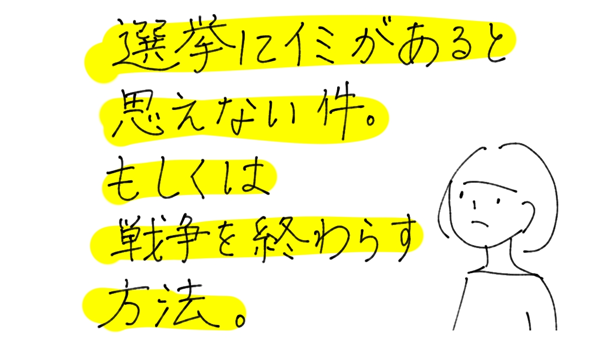 選挙にも参加したくないし、特定の党を応援することもやりたくないし、そうするべきではないと感じるし、それらの方法によって世の中の間違った方向への暴走を止めるという発想がそもそもまちがっていると感じる、というお話です。